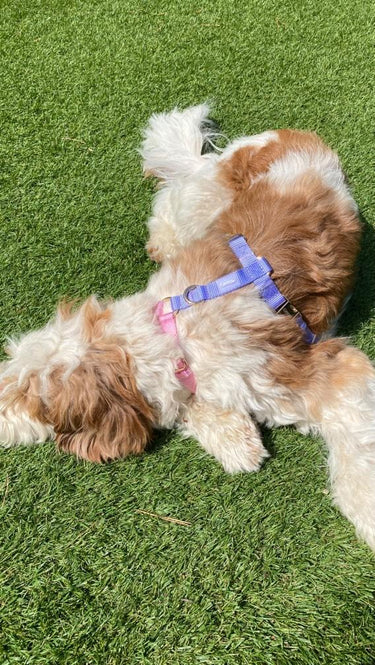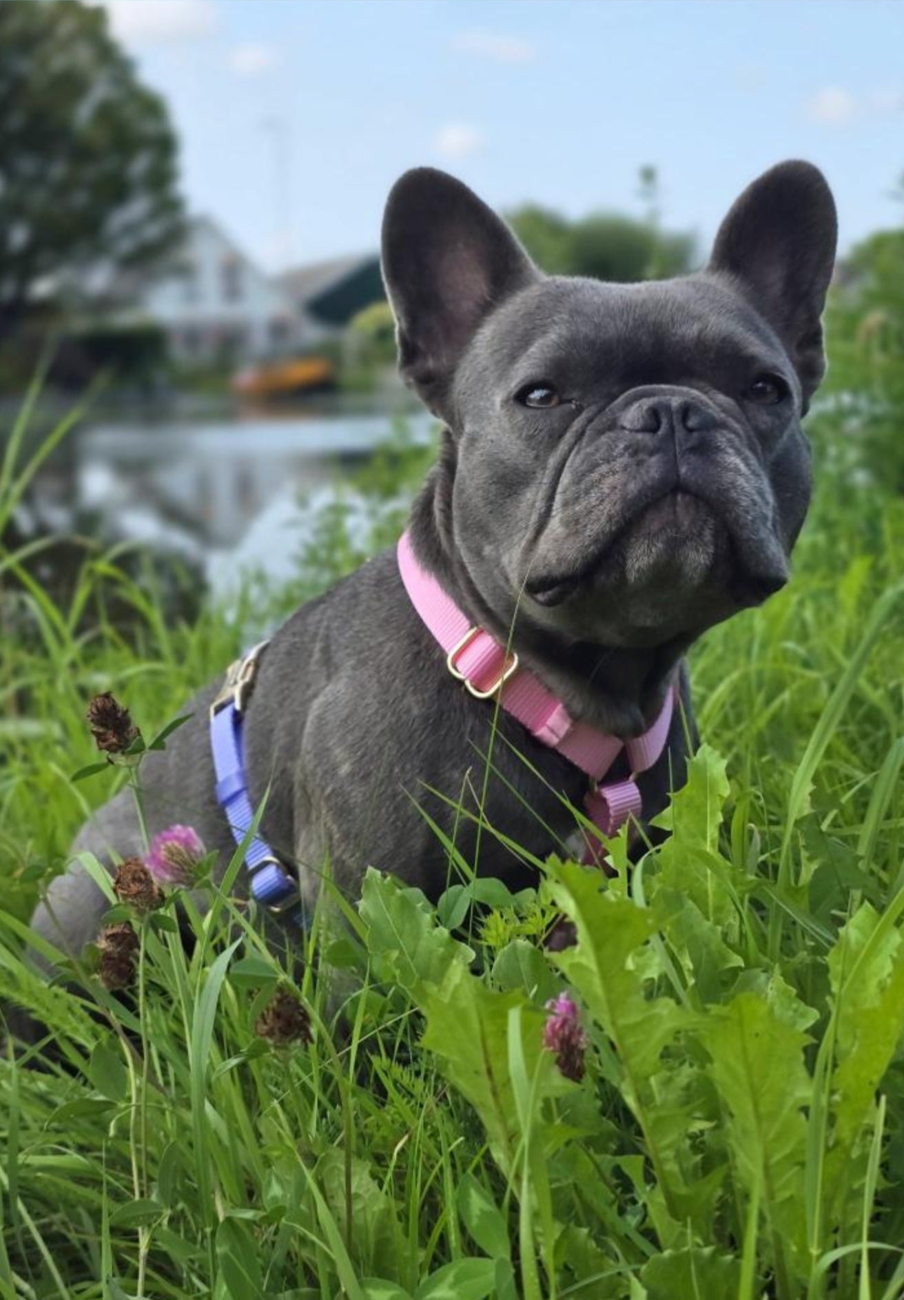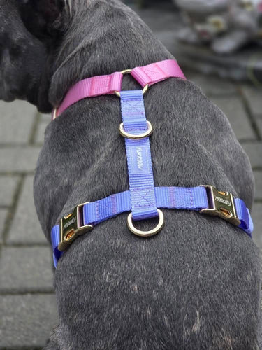 "Wij kozen voor het gekleurde roze/paarse tuig. Deze kleuren matchen perfect bij Pip haar grijze vacht. Zelf ben ik er super tevreden over, mooie pasvorm en makkelijk verstelbaar. Pip is een Franse bulldog en draagt maat M. De gouden hardware van het tuig maakt het super sjiek!"