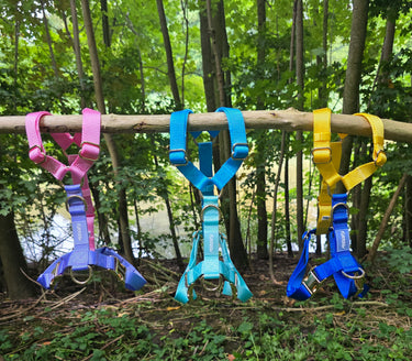 Ja, onze tuigjes en riemen kunnen tegen een regenbui, maar we raden aan ze na gebruik te laten drogen.